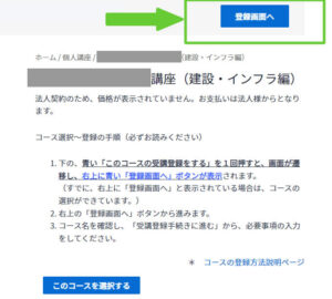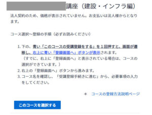 受講登録の方法 1.HOMEで、「受講登録へ」ボタンを押し、移動します。コースの登録画面でコースを選びます。 2.画面が変わったら、「お買い物カゴに追加」を押します。 3.右上に、「お買い物カゴを表示」というボタンが表示されるので、こちらから進みます。 4.「受講登録手続きに進む」を押します。(法人様との手続きのため、金額は入っておりません) 5.受講生情報を入力します(メールアドレスとパスワードは受講時に必要ですので保管してください) 6.事務局の手続きが終わりましたら、受講開始のお知らせメールが送られ、受講開始となります。 → 受講ガイドはこちら